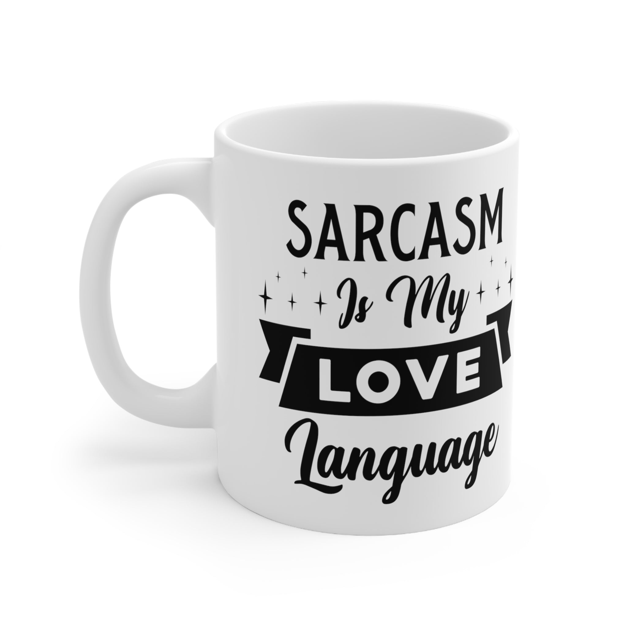 The design of the mug is truly eye – catching. It features bold black and white text elements, with “SARCASM” in uppercase black letters at the top – center, “Is My” in a flowing cursive script, “LOVE” in bold white uppercase letters on a black ribbon – shaped background (the focal point of the design), and “Language” in a cursive script below for visual balance. Small star/sparkle motifs between “SARCASM” and “Is My” add a whimsical touch.