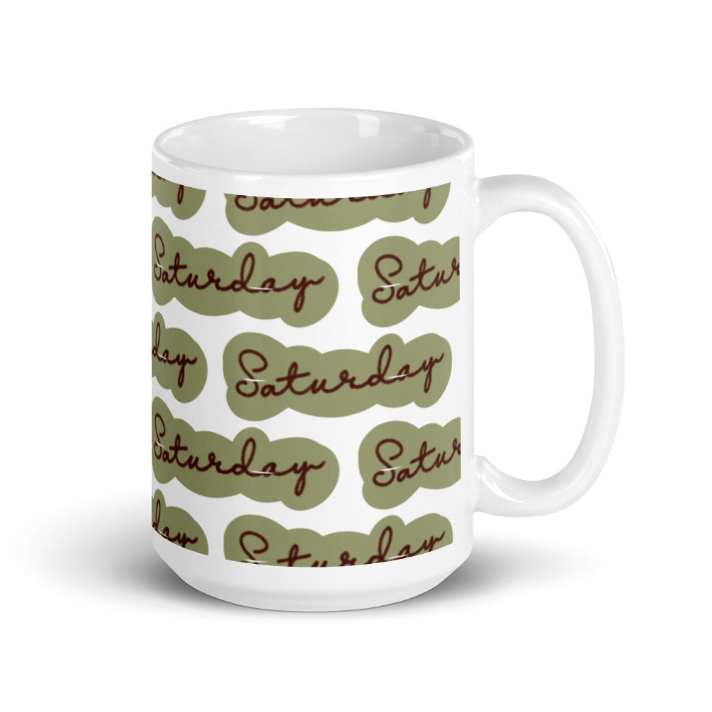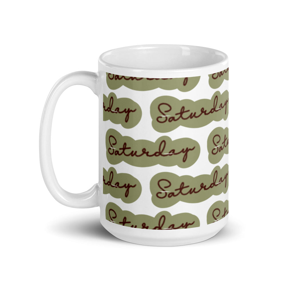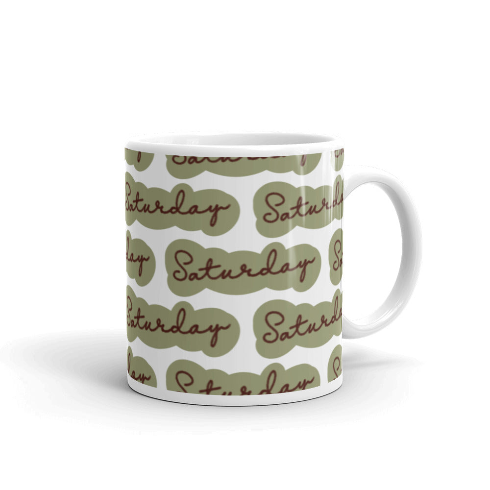 - Pattern: Repeating “Saturday” text in dark brown cursive, each enclosed in a sage – green, irregularly shaped background