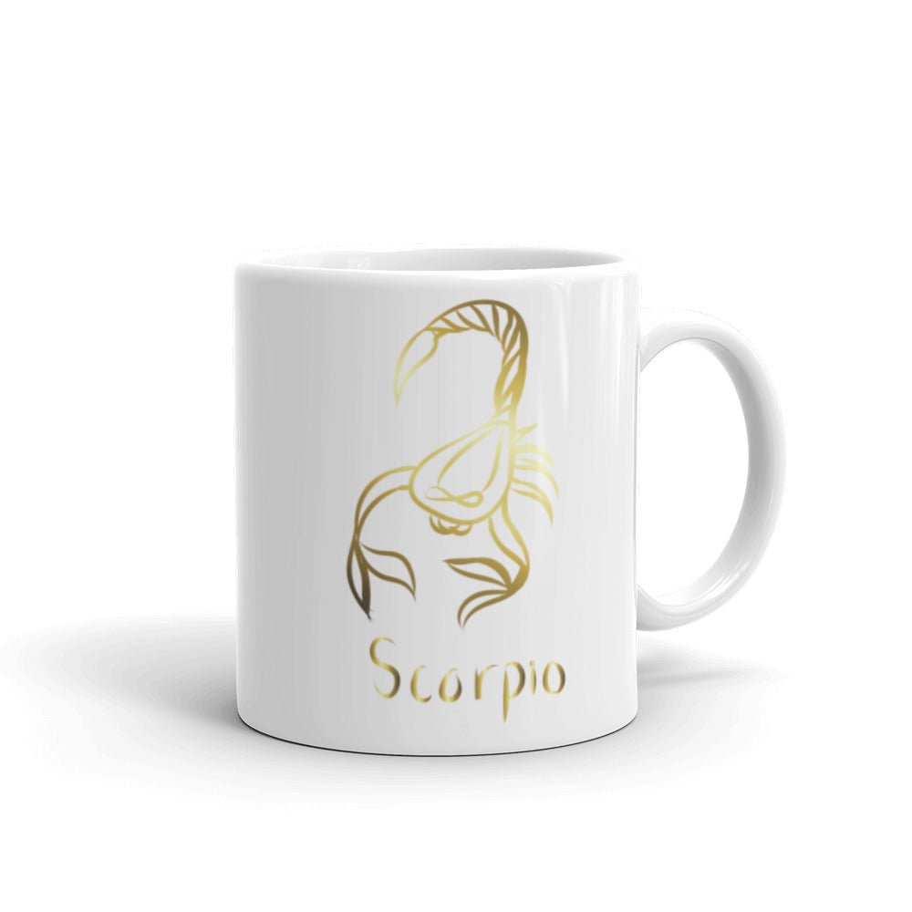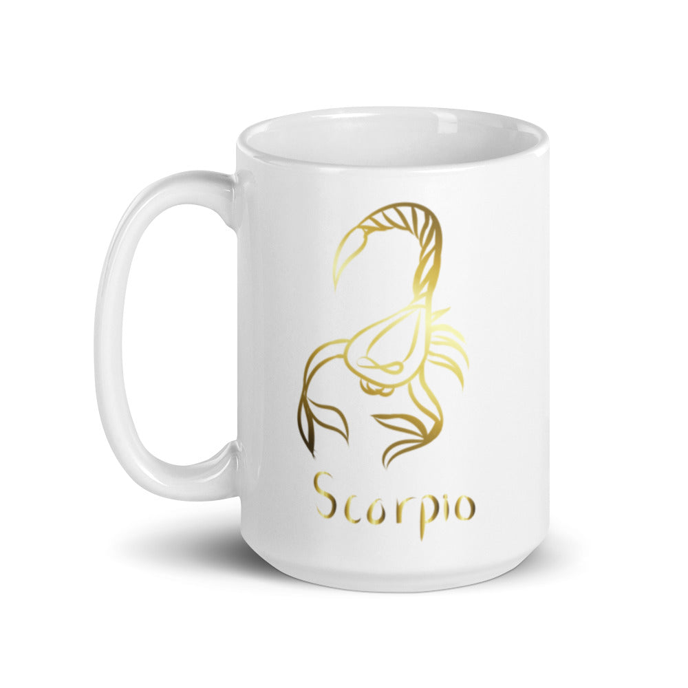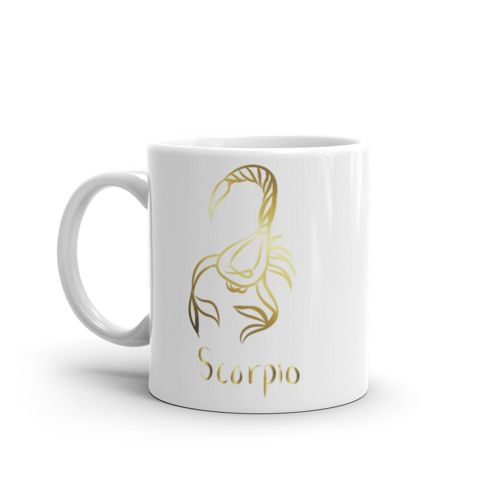 - Design: Stylized Scorpio zodiac symbol and text in gold on a white glossy background