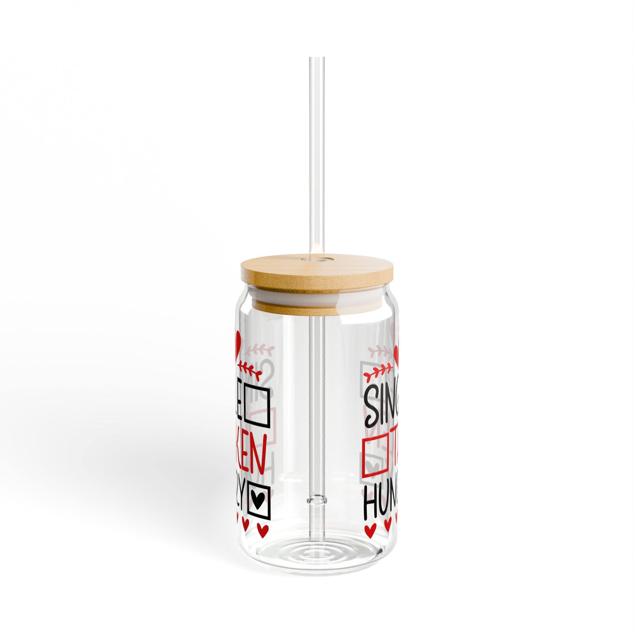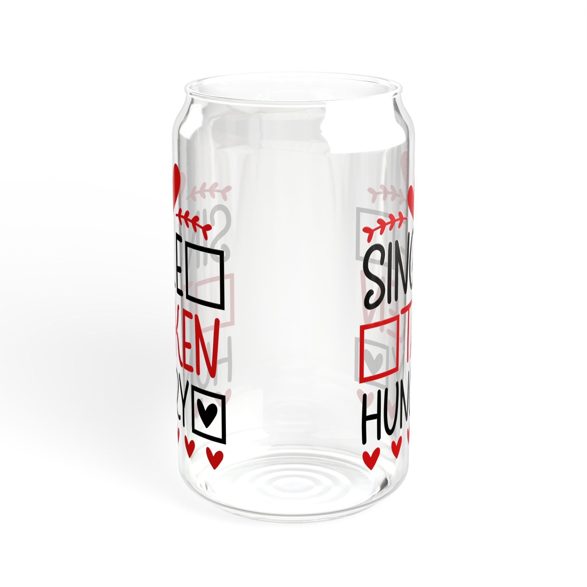 Introducing our charming Single Taken Hungry Sipper Glass, a 16oz reusable glass tumbler designed in the shape of a can, perfect for a variety of occasions! This gift – ready item is a Valentine’s Day delight with its playful text and heart – themed design. It comes in two types: one with a lid and straw, and another without.