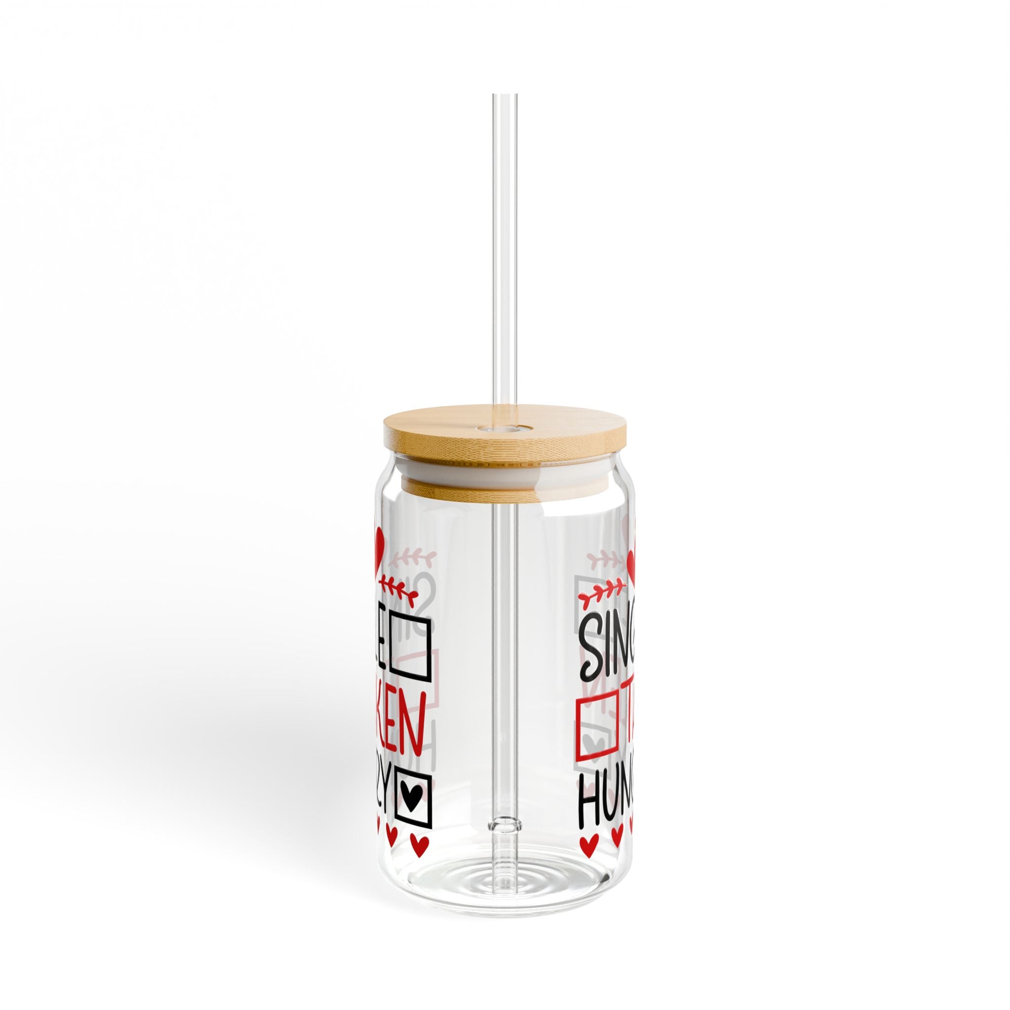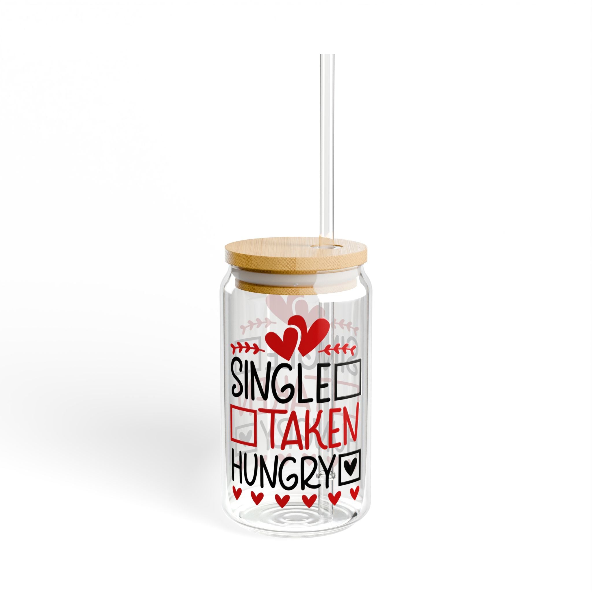 The color and design of this sipper glass are truly eye – catching. Bold, playful black and red text that reads “SINGLE”, “TAKEN”, “HUNGRY” is arranged vertically. It’s accompanied by red heart shapes (both solid and outline), black squares with small hearts inside, and mirrored gray/red text on the background, creating a dual – sided design. The small red/black decorative symbols, like arrow – like accents, add to its aesthetic appeal. The color palette of red, black, gray, and natural bamboo tones gives it a romantic and playful look.