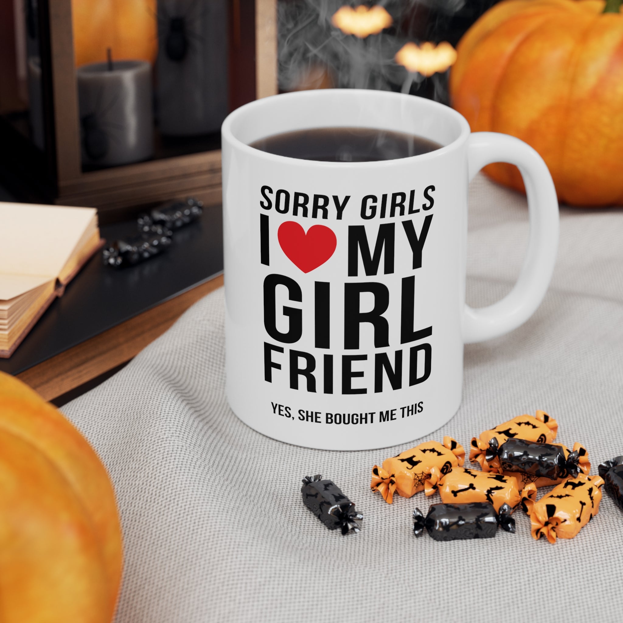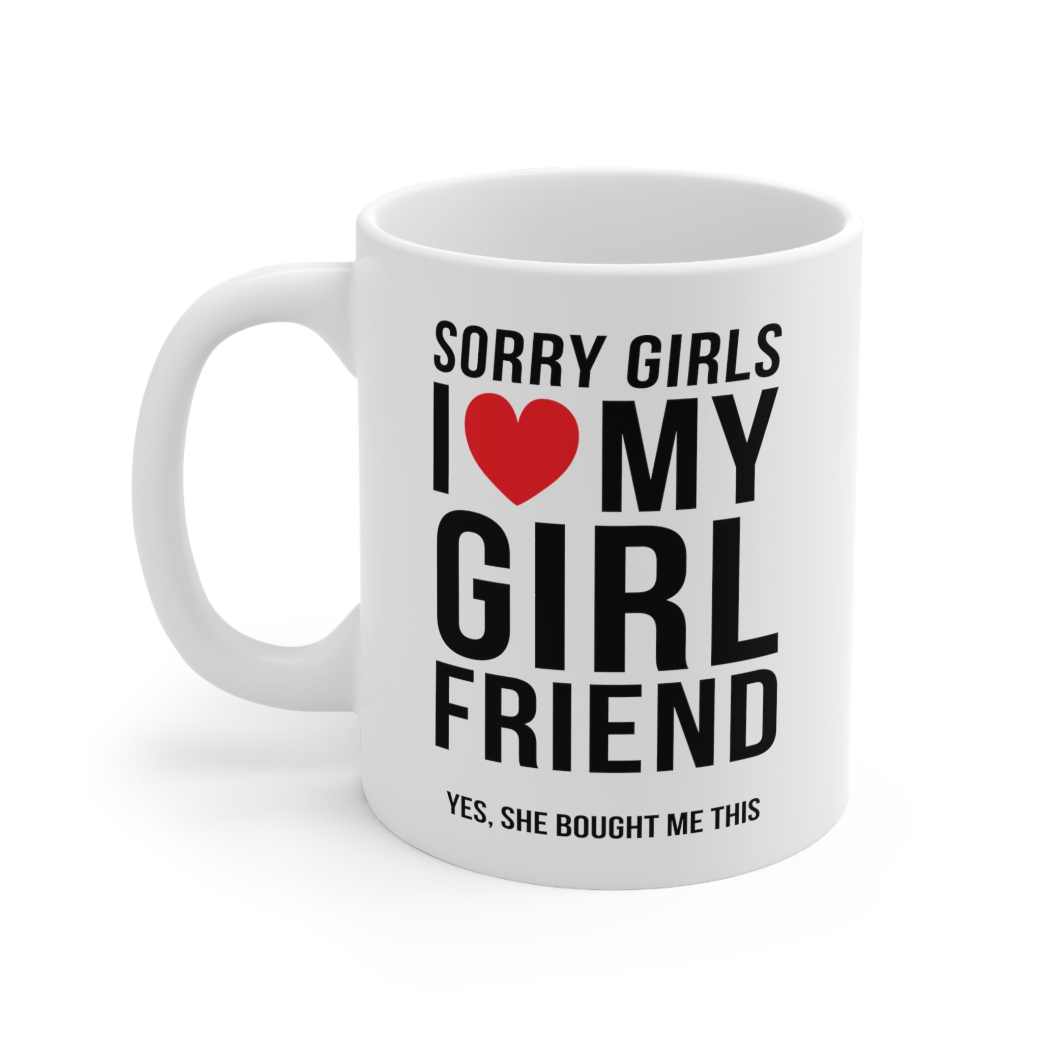 This ceramic coffee mug is crafted from high – quality ceramic or porcelain, featuring a smooth, glossy white exterior that is both elegant and practical. The bold black text and solid red heart printed on the mug create a high – contrast and legible design. The text includes “SORRY GIRLS” at the top – center in small uppercase letters, “I ❤️ MY GIRLFRIEND” with a medium – sized “I”, a red heart, a smaller “MY”, and large, bold uppercase “GIRLFRIEND”, and “YES, SHE BOUGHT ME THIS” at the bottom – center in small uppercase letters.