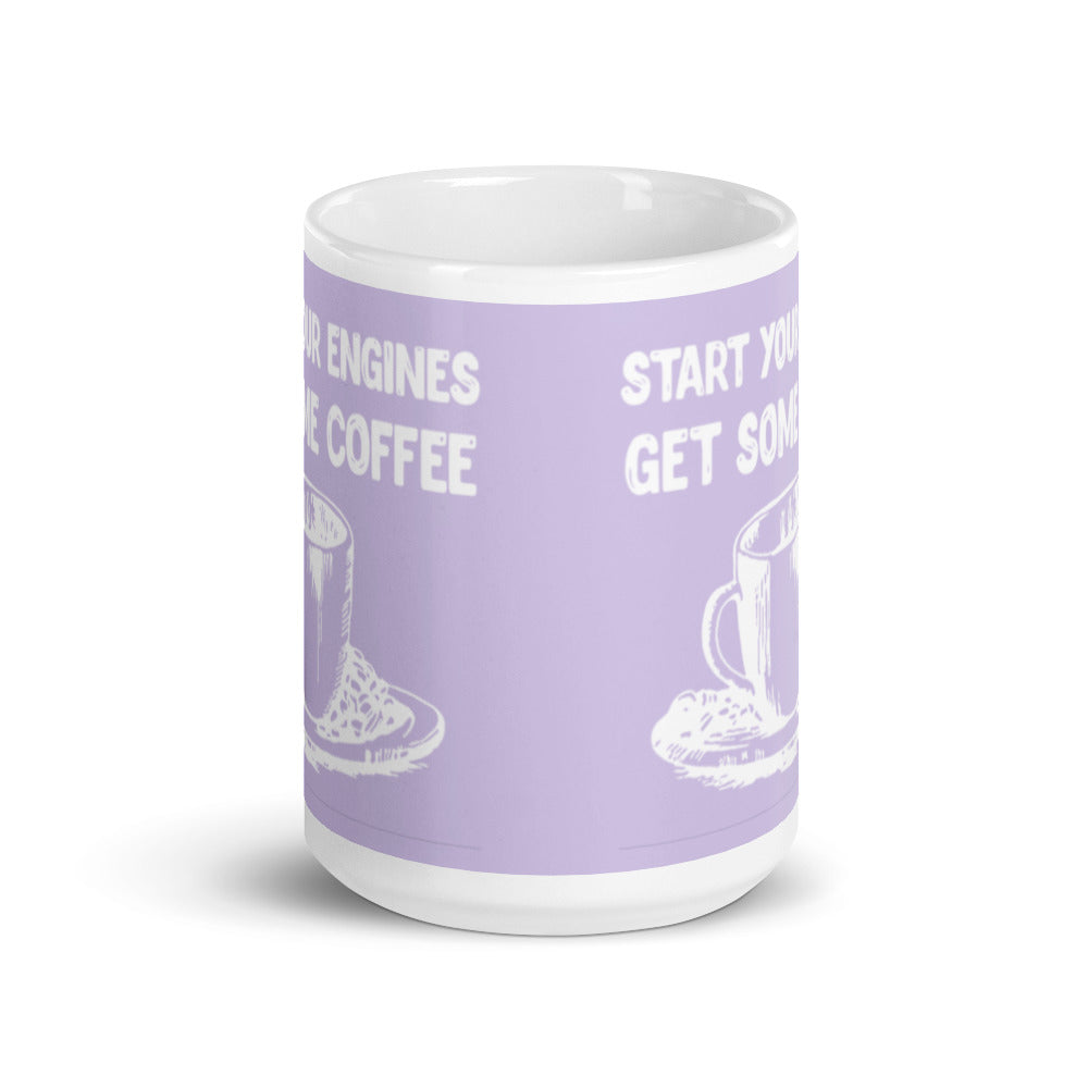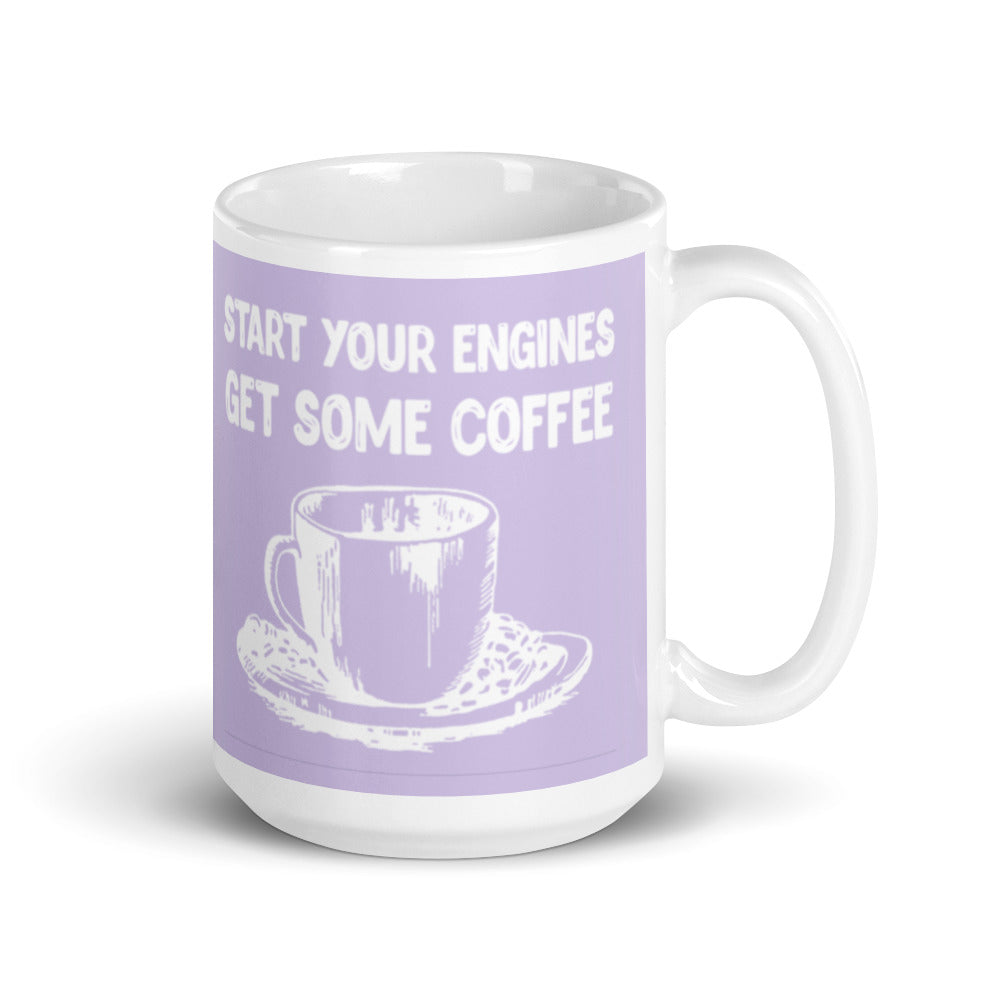 - Design: Features a white graphic illustration of a coffee cup on a saucer and bold white text on a light purple background