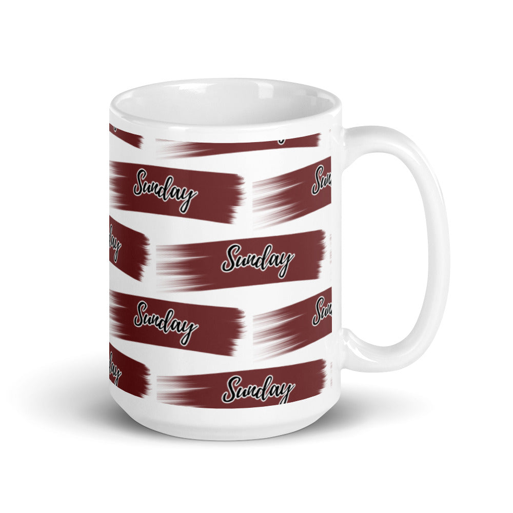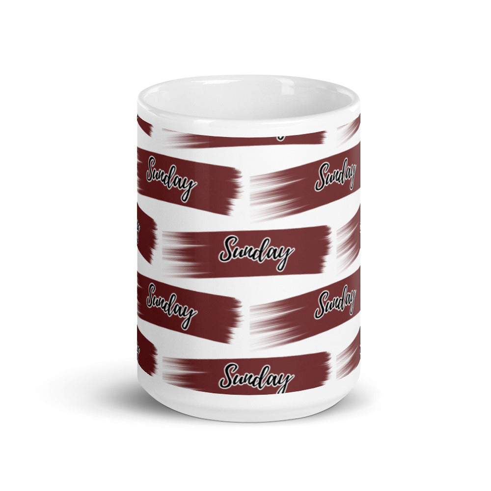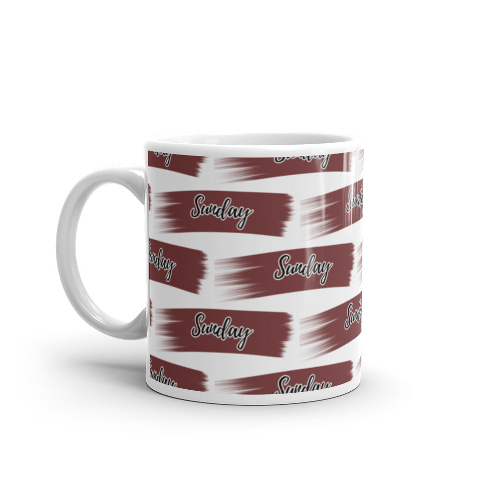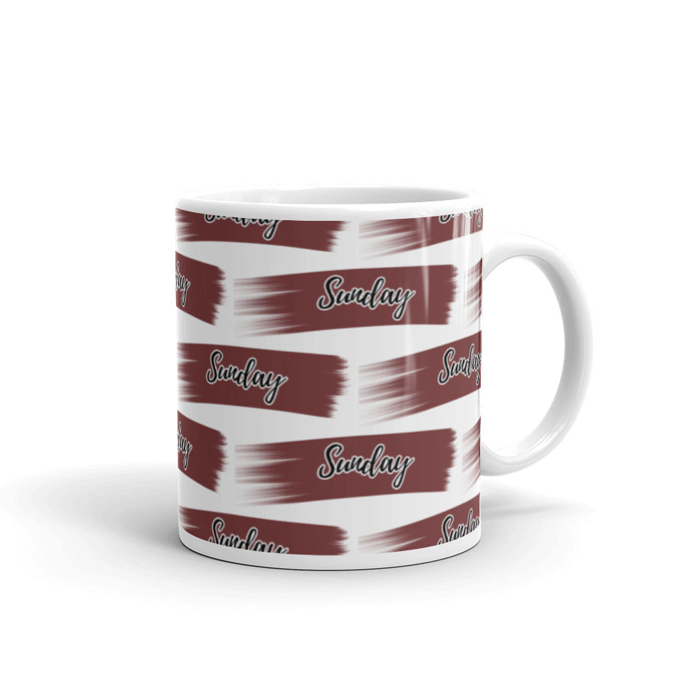 - Design: Repeating maroon brushstroke pattern with ‘Sunday’ text in cursive font