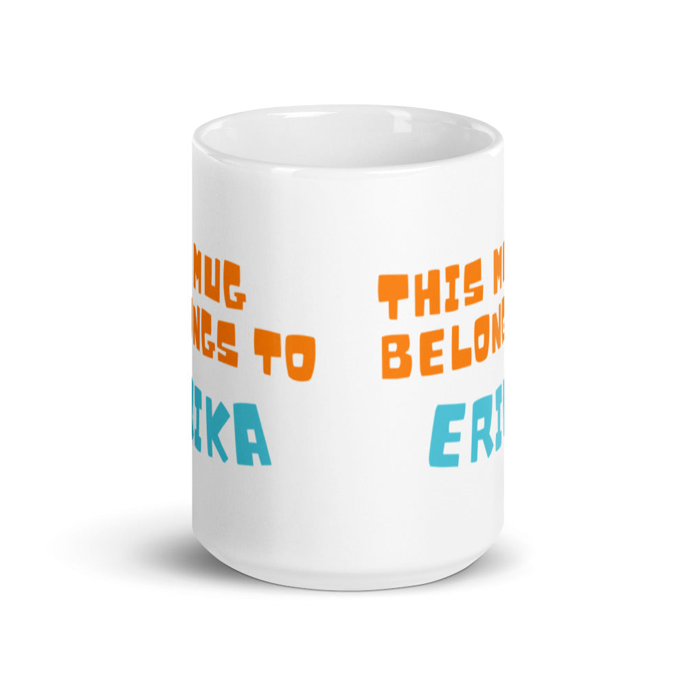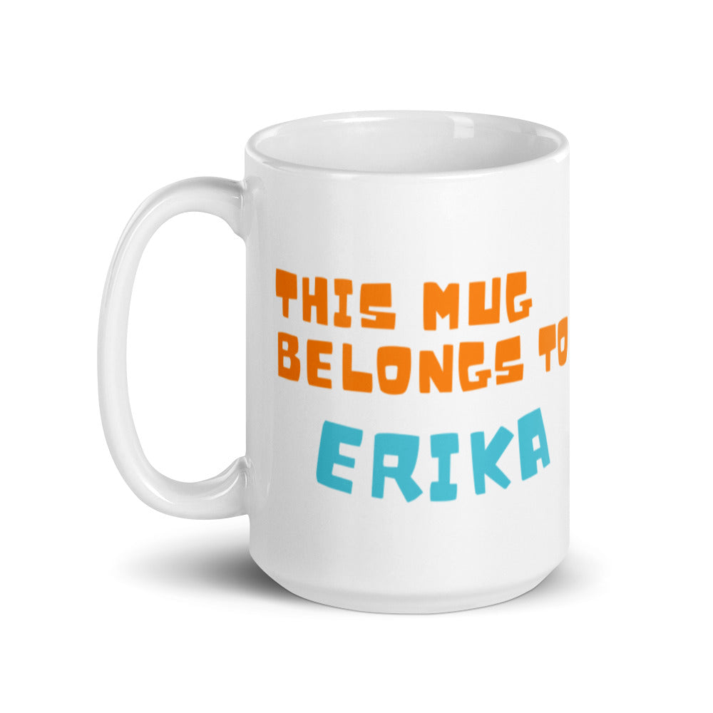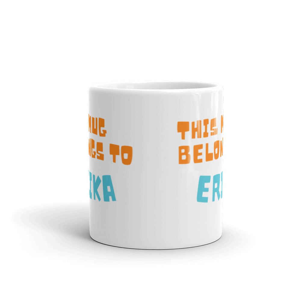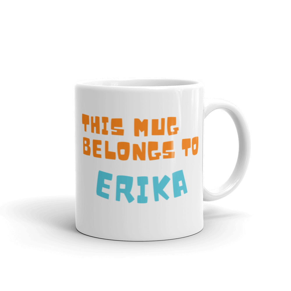 - Printed Design: Bold orange lettering for “THIS MUG BELONGS TO” and light blue lettering for “ERIKA”