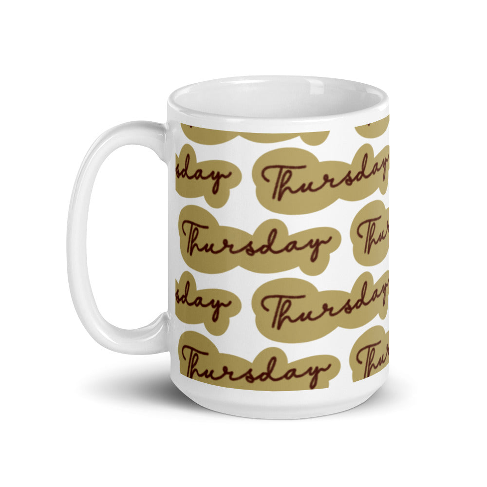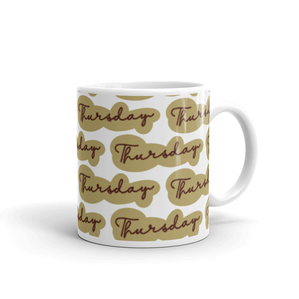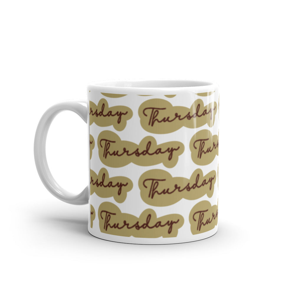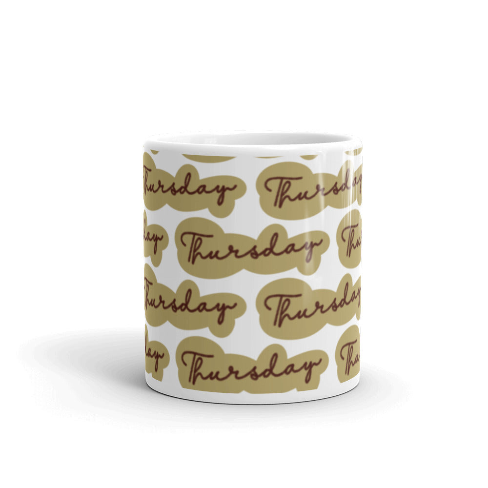 - Design: Repeated “Thursday” text in cursive on tan/brown cloud – shaped backgrounds