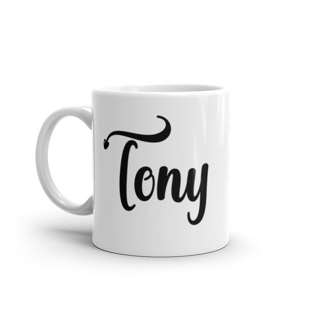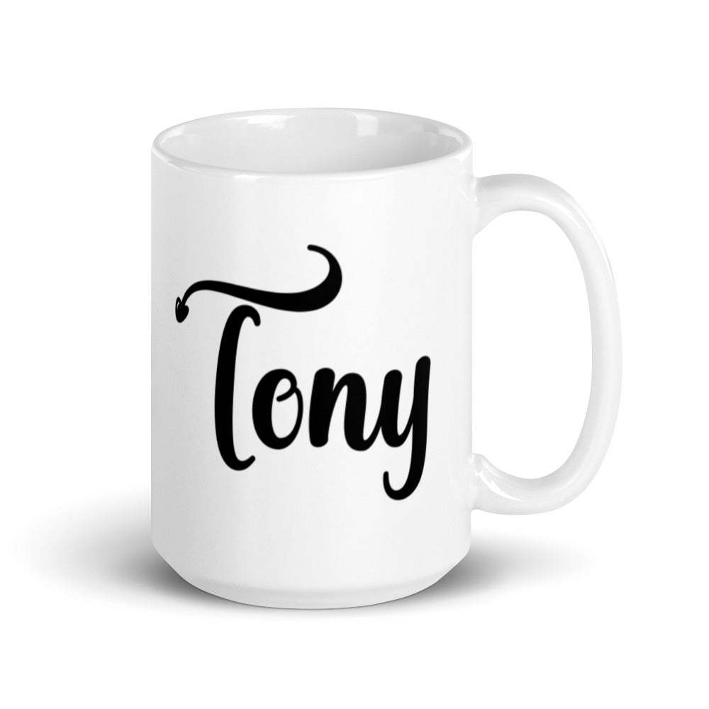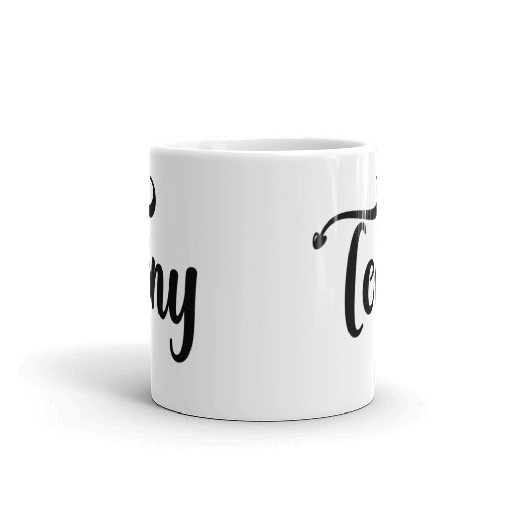 - Appearance: Bright white, glossy ceramic exterior with black, stylized script text; tall and cylindrical shape with slightly flared base and standard curved white handle; decorative swoosh/f flourish above the ‘T’ ending in a small heart shape