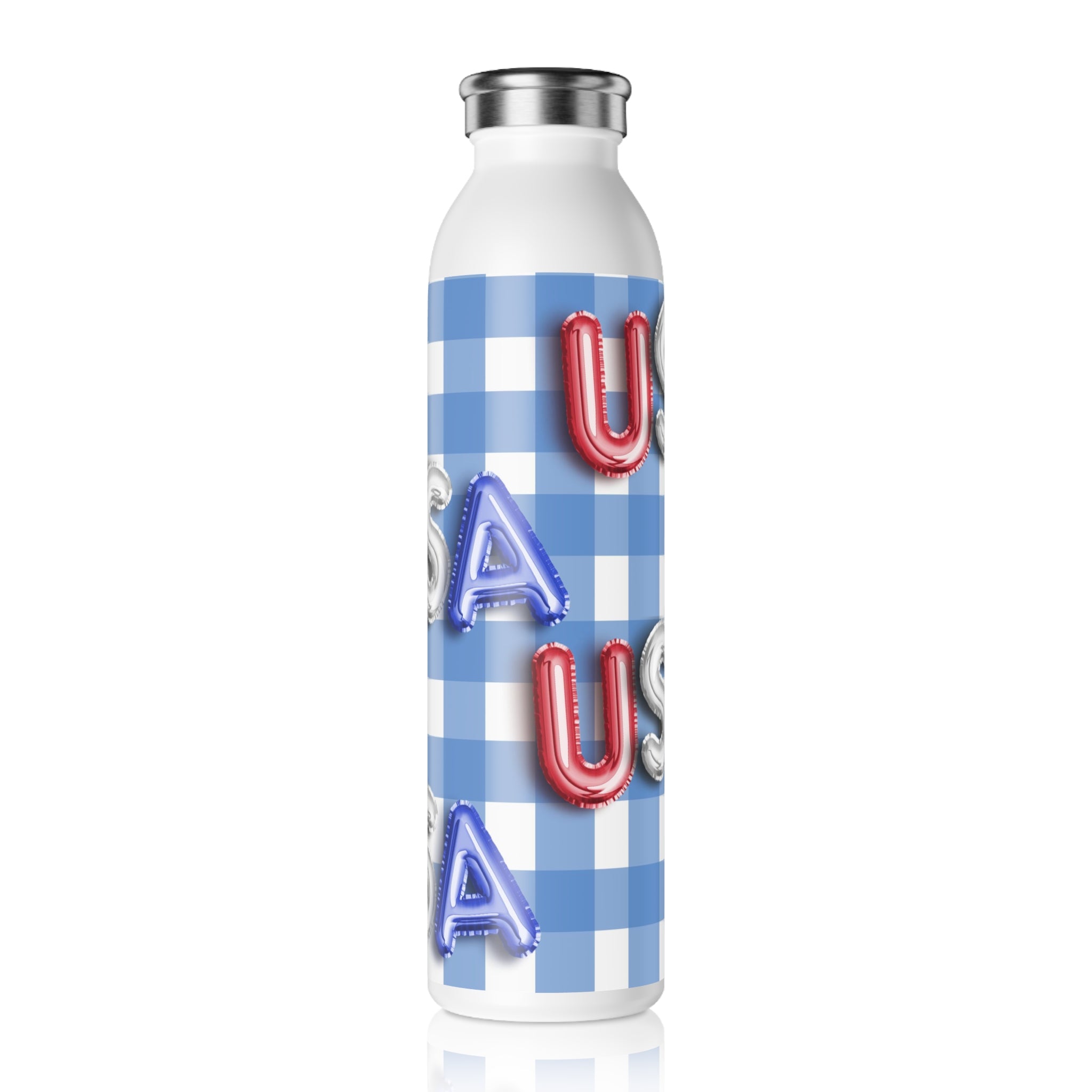 The color scheme of this bottle is a striking combination of white and blue. The base pattern is a blue – and – white gingham (checkered) pattern that gives it a classic, patriotic look. The 3D balloon – like letters in red (U), white/silver (S), and blue (A) spelling “USA” are repeated vertically and potentially mirrored, creating a festive and patriotic aesthetic, perfect for 4th of July or other patriotic events.
