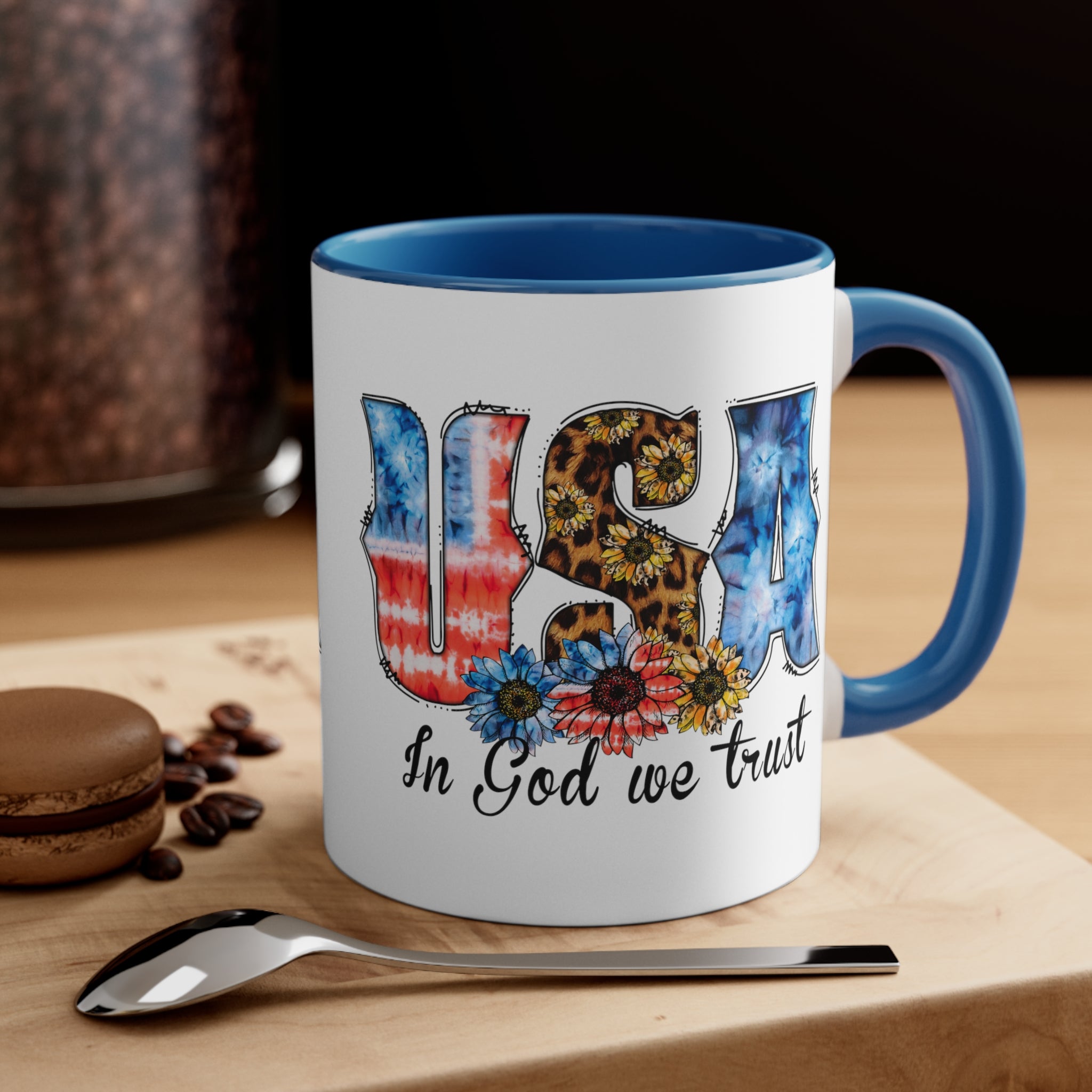 Introducing the USA In God We Trust Accent Coffee Mug, a unique blend of style and functionality that’s perfect for your daily beverage needs or as a thoughtful gift. This 11oz ceramic mug is a true standout, featuring a captivating design that combines patriotic, trendy, and nature themes.