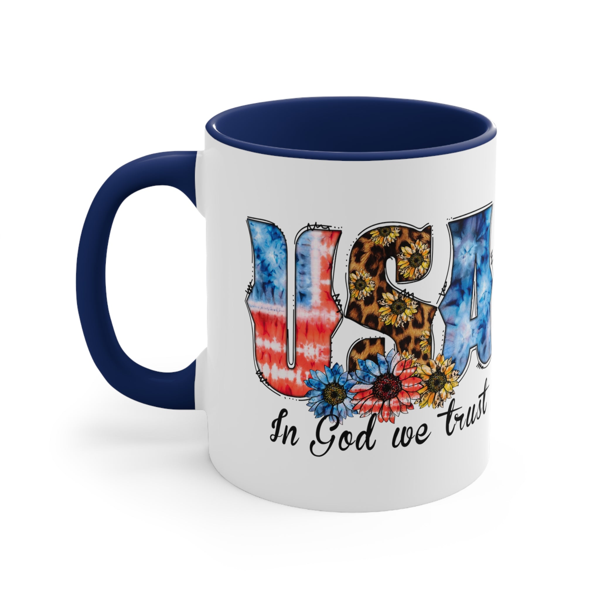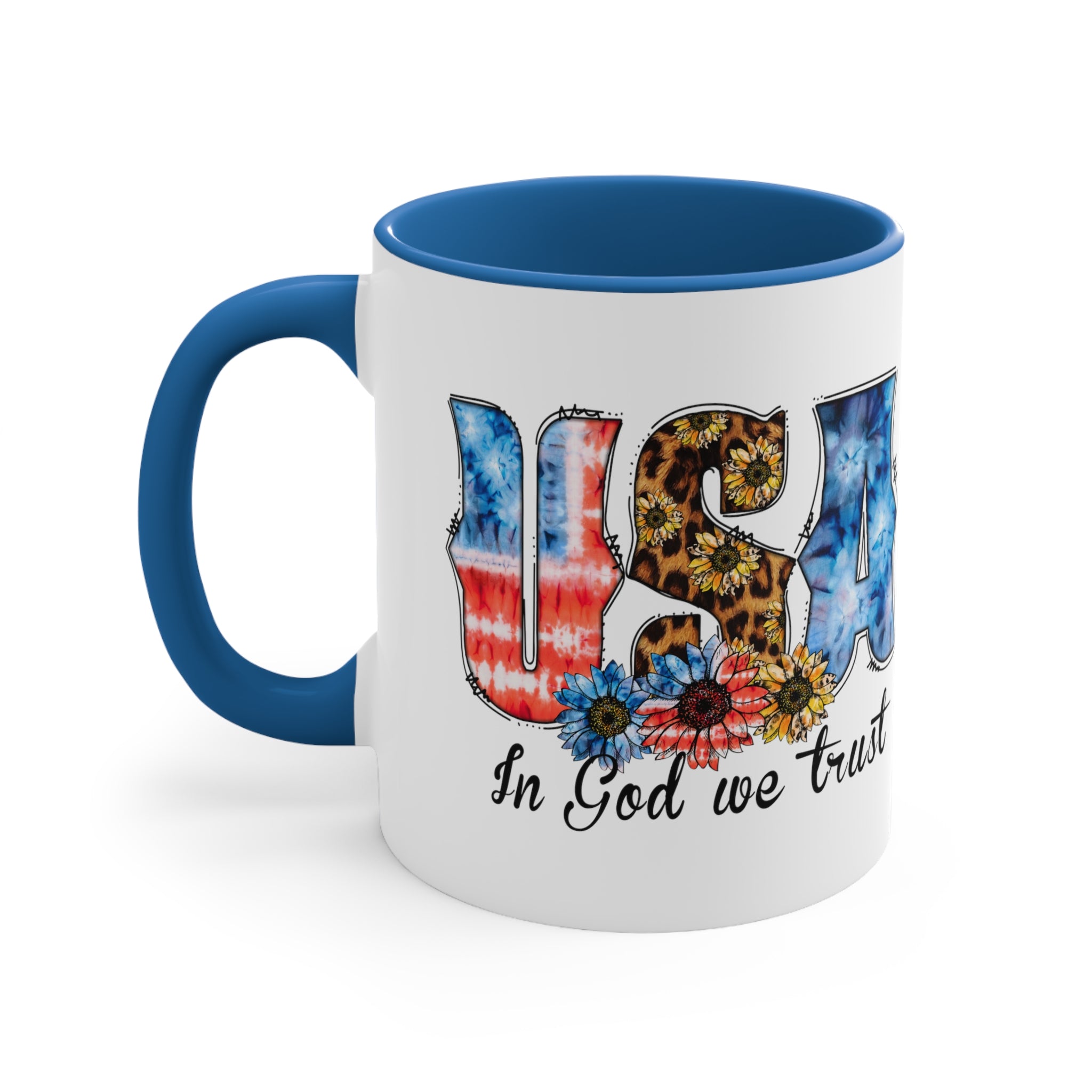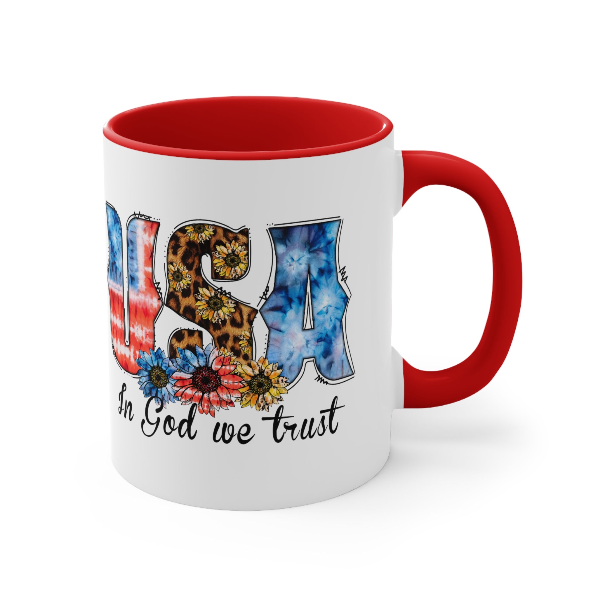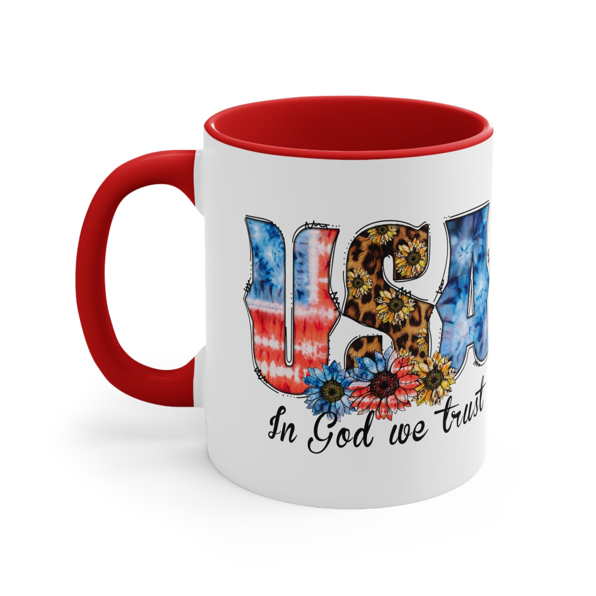 The exterior of the mug has a pristine white base, upon which a vibrant and detailed design is printed using high – quality sublimation or heat transfer printing. The large, stylized letters of “USA” are a visual treat. The “U” and “S” showcase tie – dye patterns mimicking the American flag, with red, white, and blue hues, while the “S” also incorporates a leopard print with sunflowers. The “A” is adorned with a blue tie – dye. At the bottom, colorful flowers including blue, red, and yellow sunflowers add a bohemian touch, and below them, the phrase “In God we trust” is written in a black cursive font, emphasizing its patriotic – religious theme.