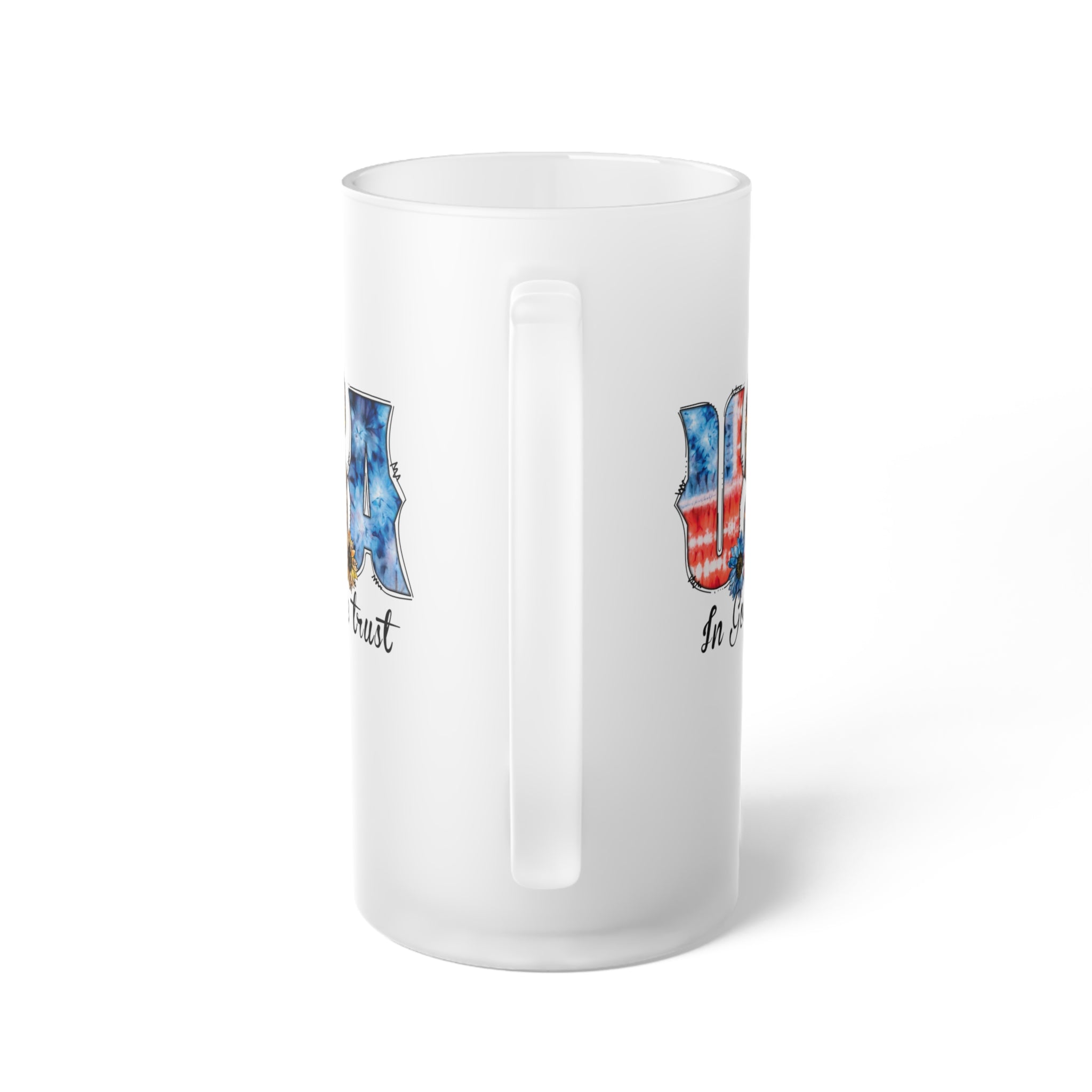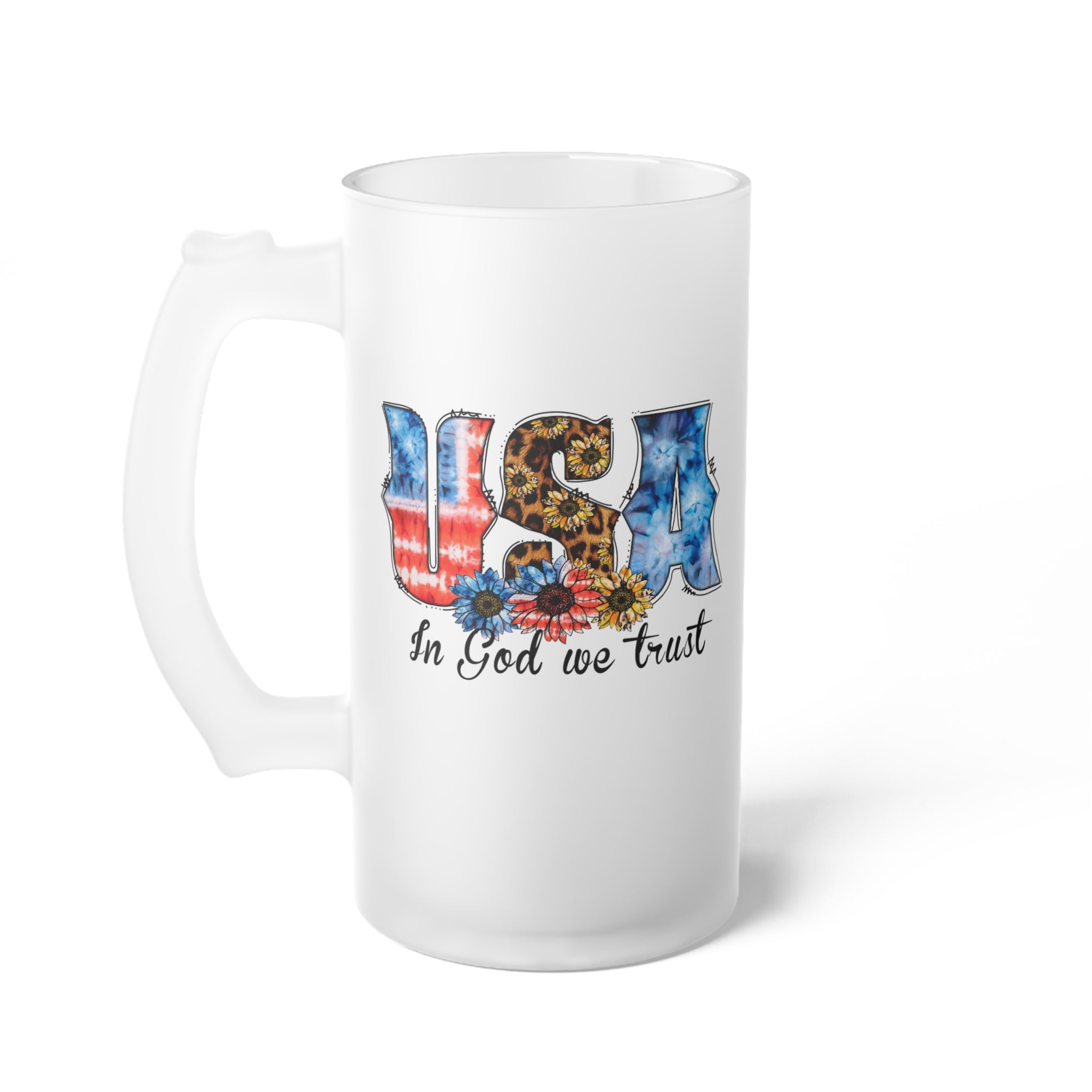 The design of this mug is a true showstopper. The focal point is the word “USA” with each letter in a unique pattern. The “U” features a red – and – white tie – dye resembling an American flag, the “S” is a leopard print adorned with yellow sunflowers, and the “A” is a blue tie – dye with a white outline. Below the “USA,” there are three beautiful flowers: a blue one with black center, a red one with black center, and a yellow sunflower with a brown center. The phrase “In God we trust” is written in a flowing, black cursive font, centered below the flowers. All these elements stand out vividly against the solid white frosted background.
