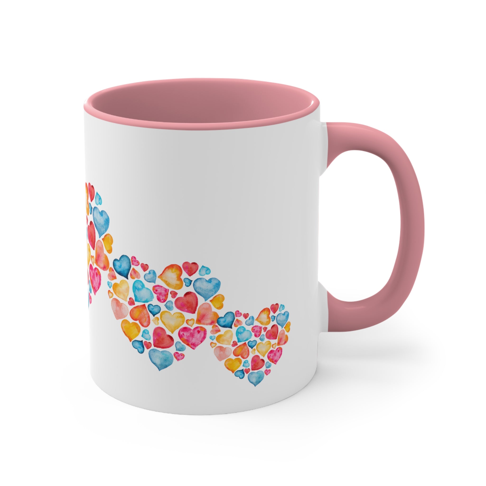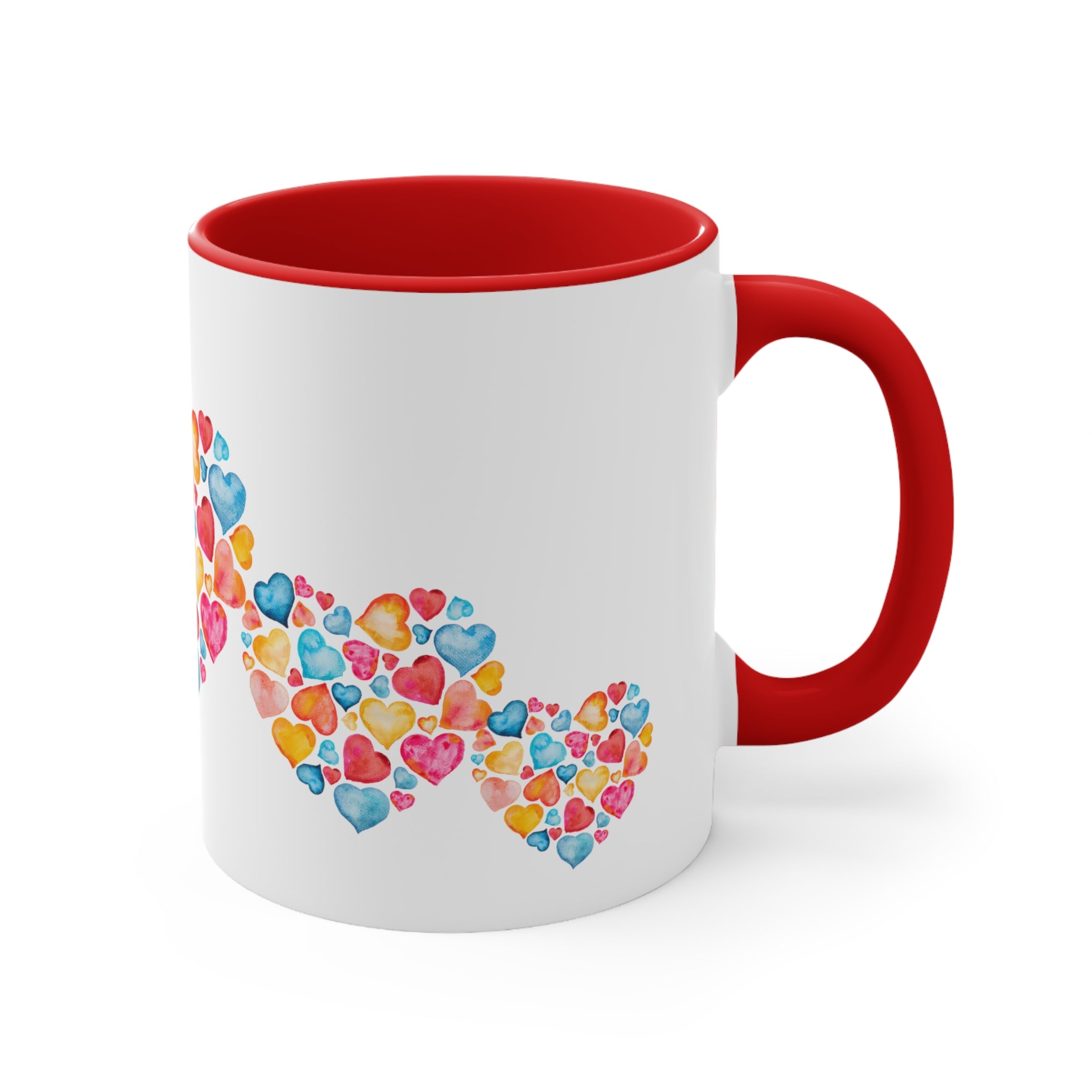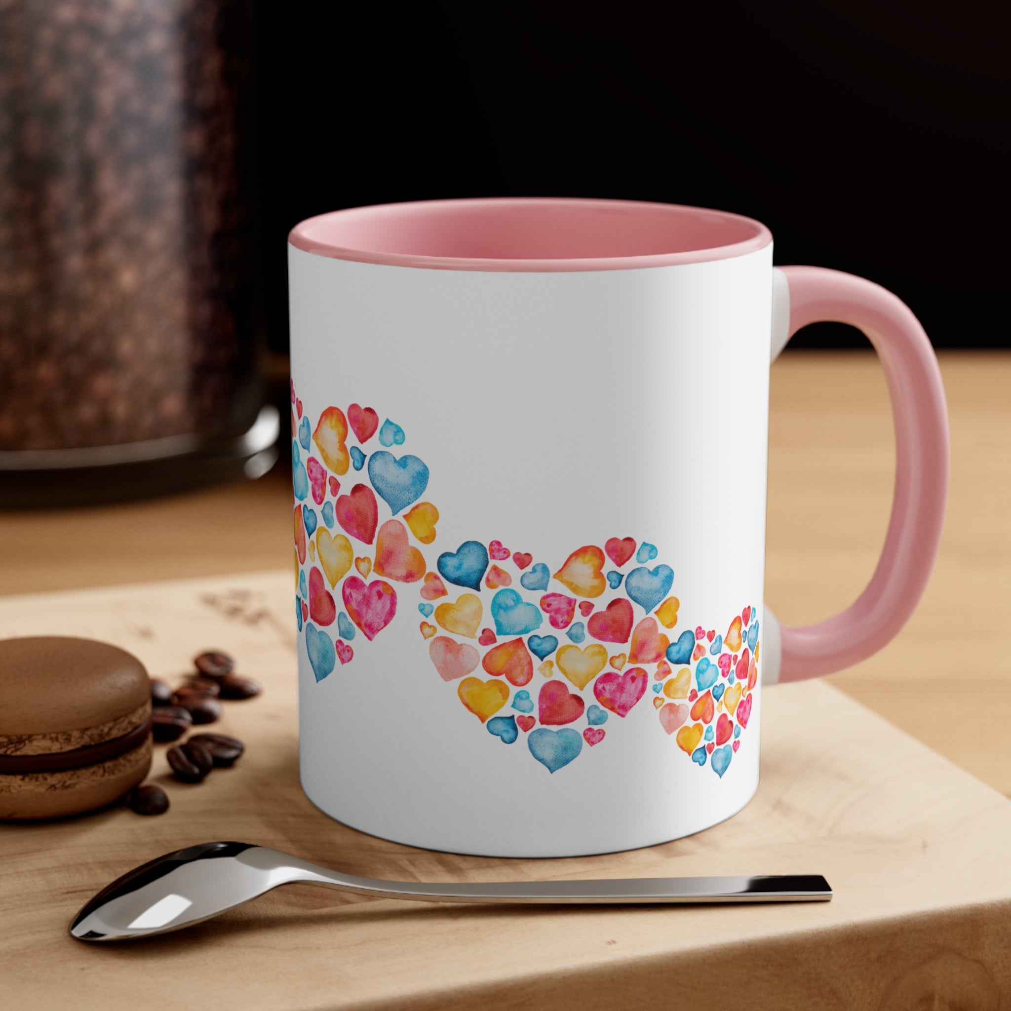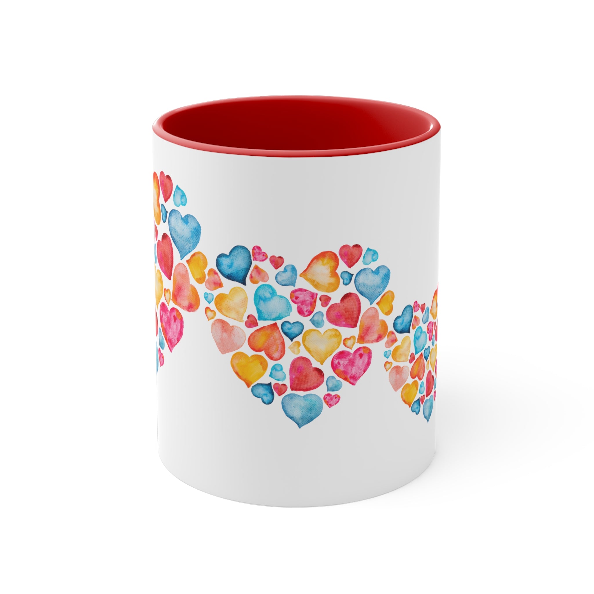 The exterior of the mug features a white base adorned with a vibrant, watercolor-style pattern of hearts in various shades of red, pink, blue, yellow, and orange. The hearts are arranged in a continuous, curving design, either as a full heart shape or a scattered, flowing pattern around the mug. The interior and handle come in two-tone options – pink or red, creating a cohesive and visually appealing contrast with the white exterior.