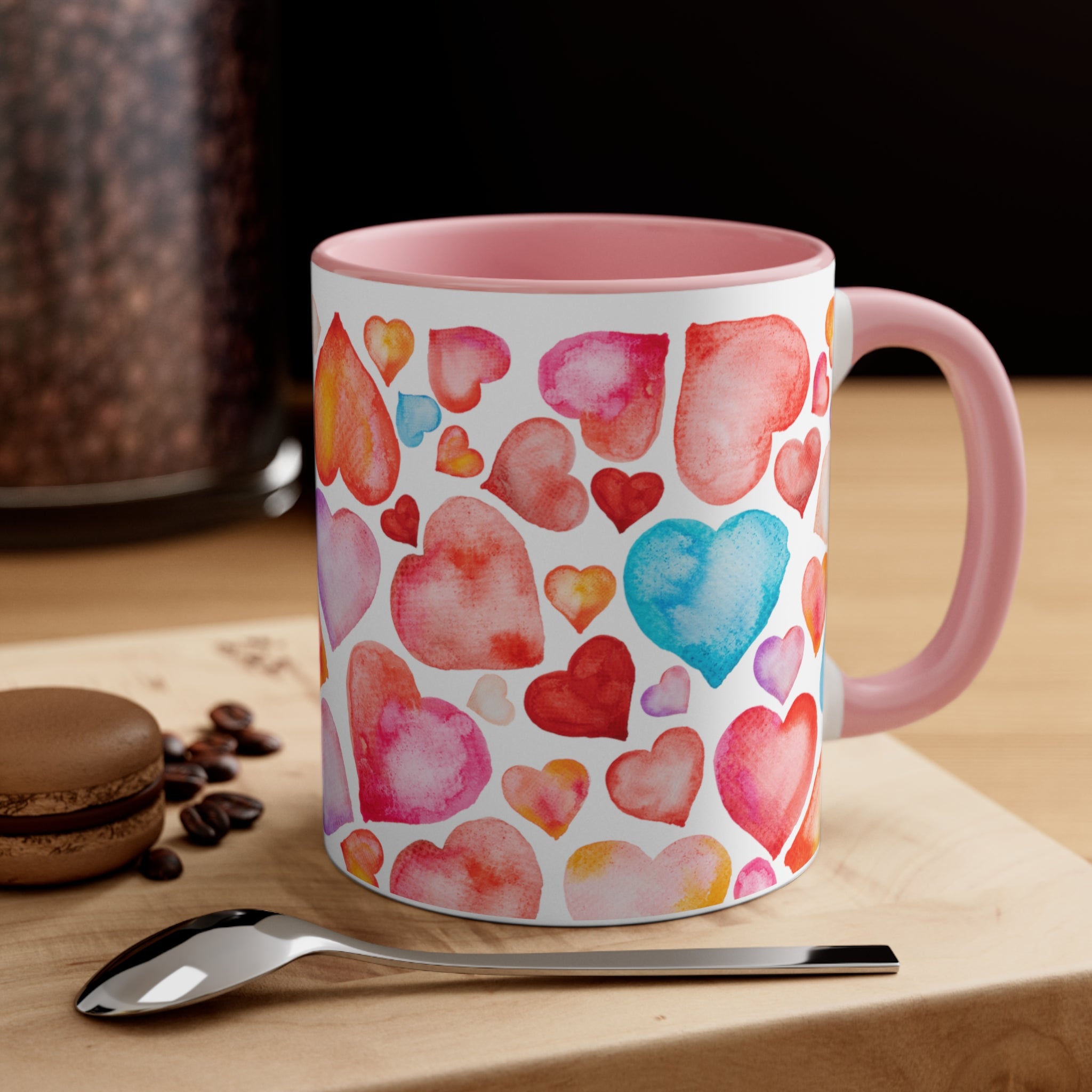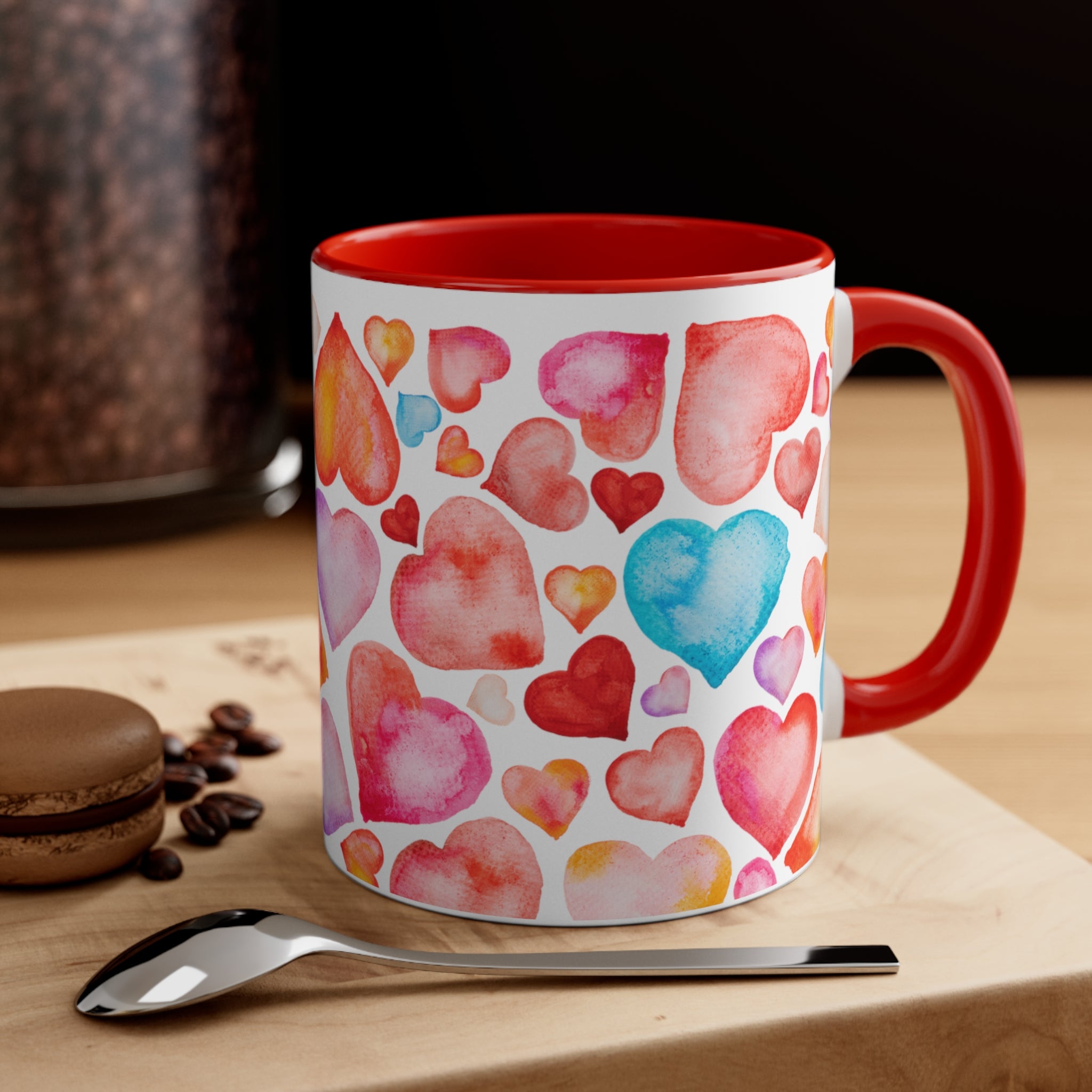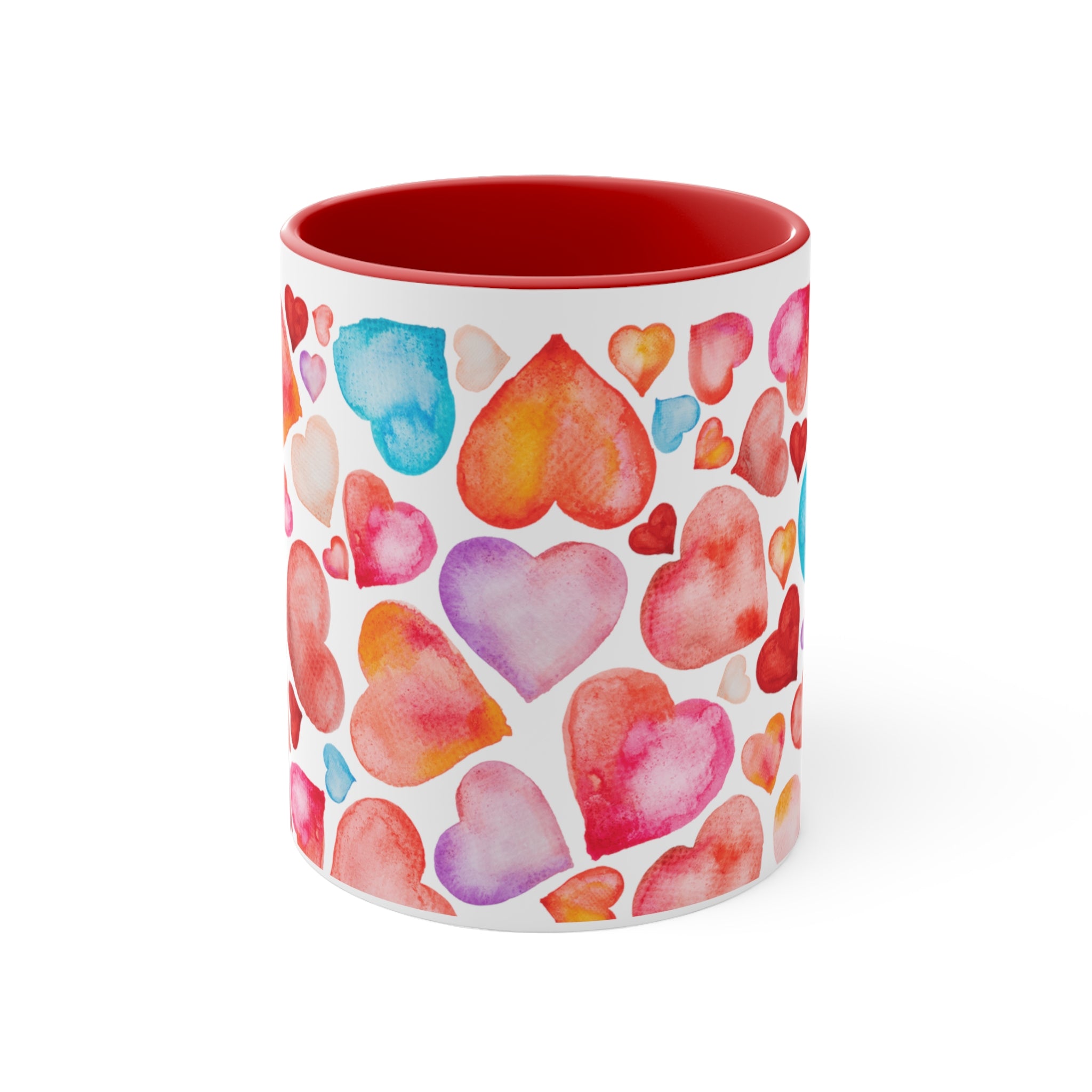 Indulge in the charm of our Valentine Hearts Accent Coffee Mug, a delightful addition to your daily beverage routine. This 11oz ceramic mug is a perfect blend of style and functionality, designed to bring a touch of romance and color to every sip.