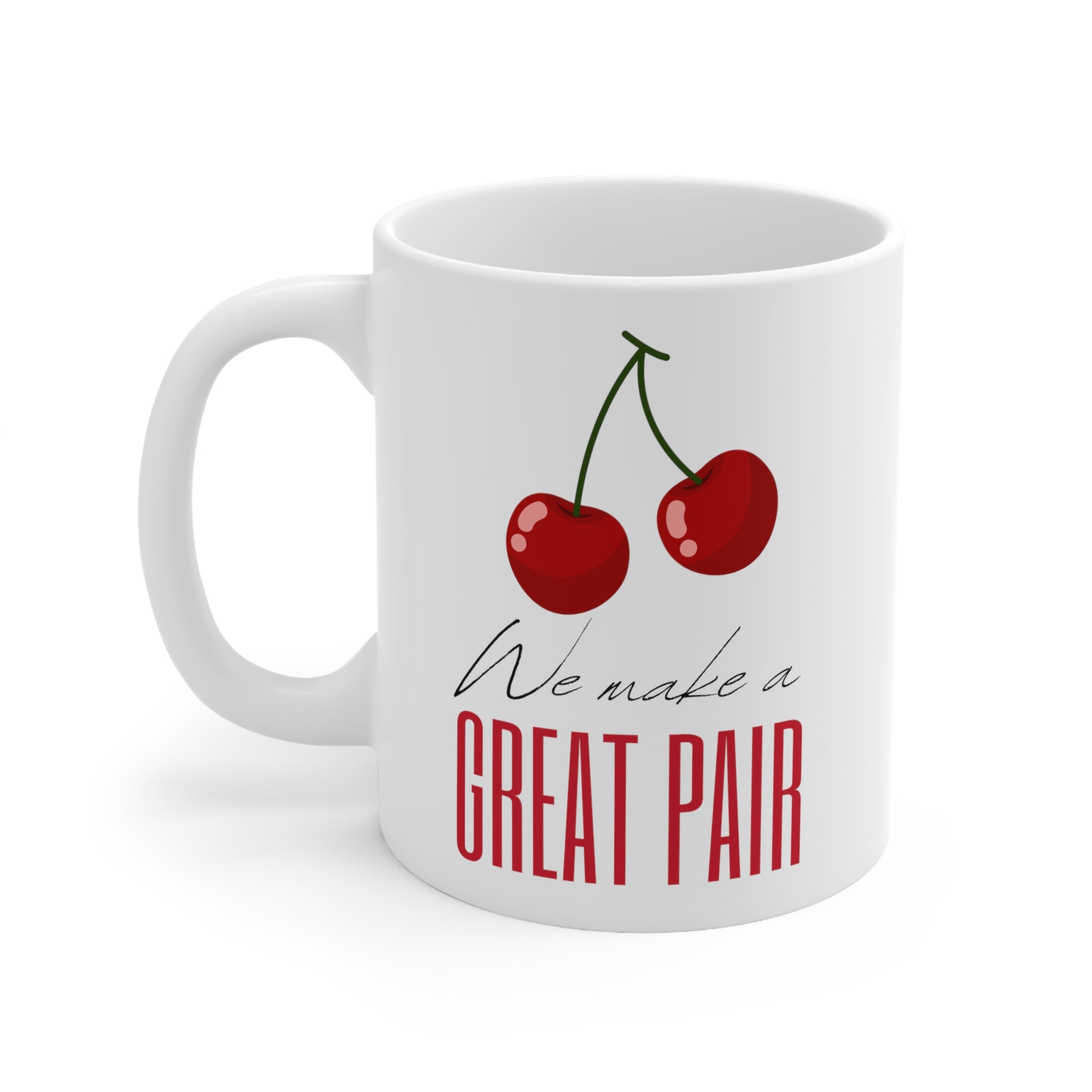 The mug’s body is a pristine white, providing a perfect backdrop for the playful design elements. Two stylized, glossy red cherries with green stems take center stage, emphasizing the ‘pair’ theme. The text ‘We make a’ is written in a cursive, black script font, while ‘GREAT PAIR’ is in bold, uppercase red sans – serif letters. The color contrast between the red cherries and text on the white background is eye – catching and easy to read, adding to the mug’s overall aesthetic appeal.