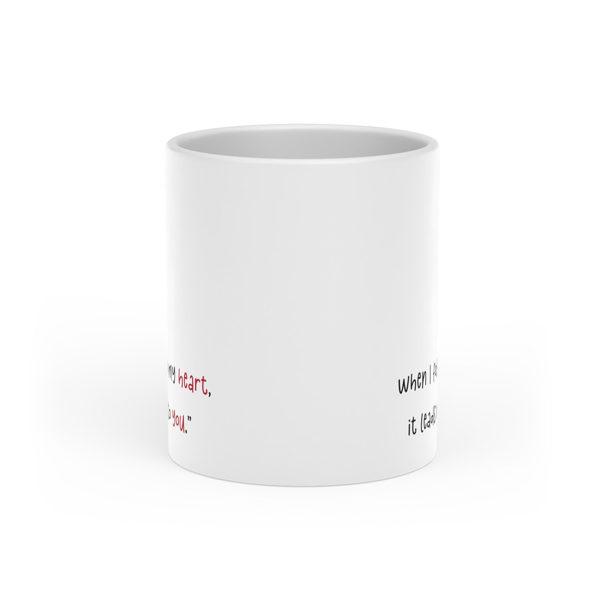 The mug features a heart – shaped handle made from the same ceramic material, ensuring both an aesthetically romantic look and a comfortable, ergonomic grip. The handwritten – style black text on the front, with the words “heart” and “you” in vibrant red, creates a visual emphasis that truly captures the essence of the heartfelt message “When I follow my heart, it leads me to you.” The design wraps slightly around the mug, with partial text repetition on the sides and back, adding to its charm.