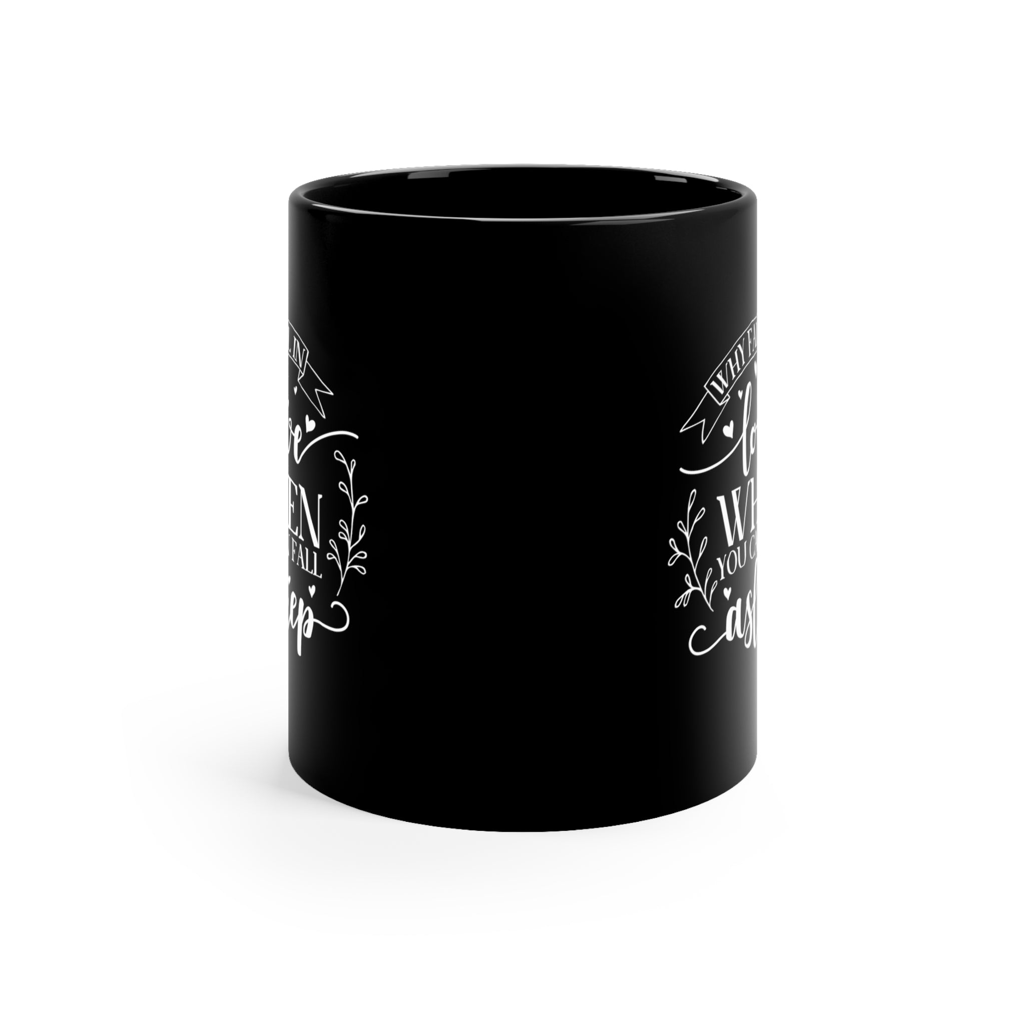 The mug features a glossy black exterior that not only looks sleek but also ensures durability and easy cleaning. The white, hand – lettered text and decorative elements add a touch of romance and whimsy. The banner – style text ‘WHY FALL IN’, the large and playful cursive ‘love’, the bold serif ‘WHEN YOU CAN FALL’, and the flowing script ‘asleep’ create a fun wordplay. Small heart symbols are scattered around the text, and delicate white vine/branch illustrations flank the central text, enhancing its aesthetic appeal.