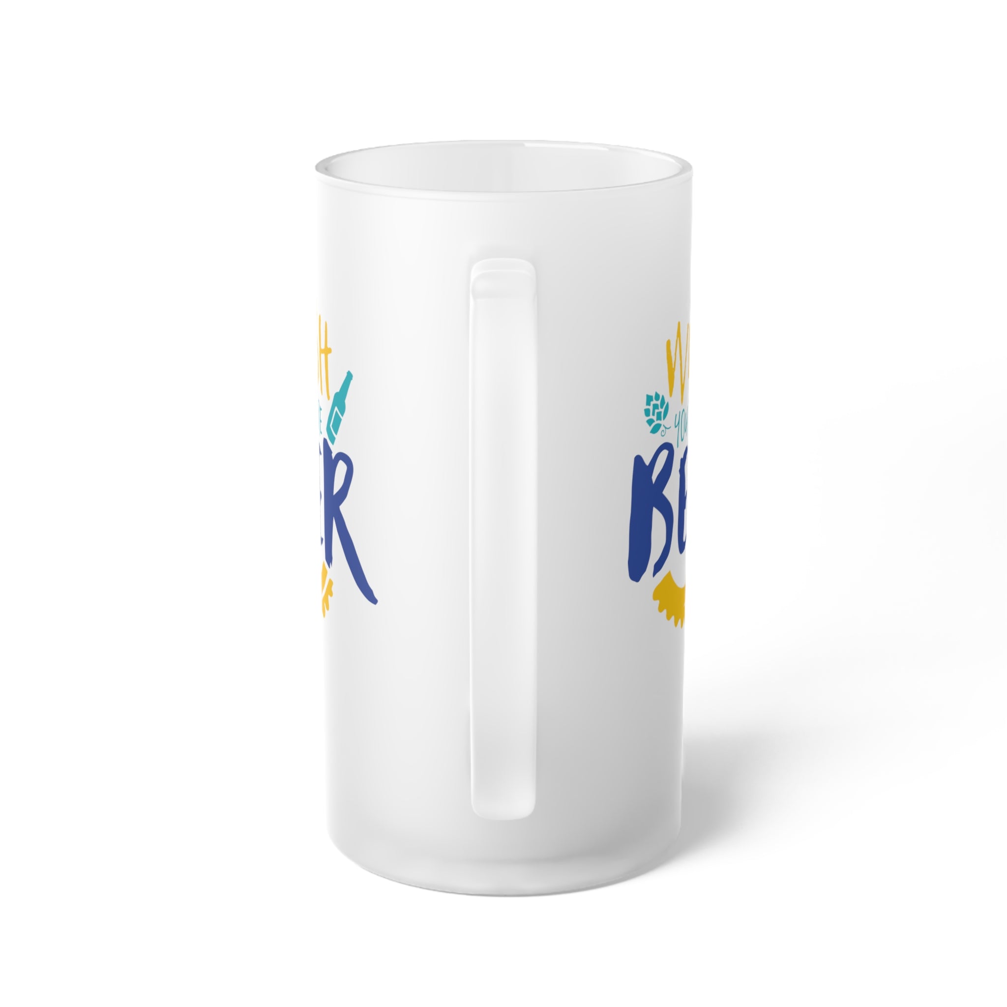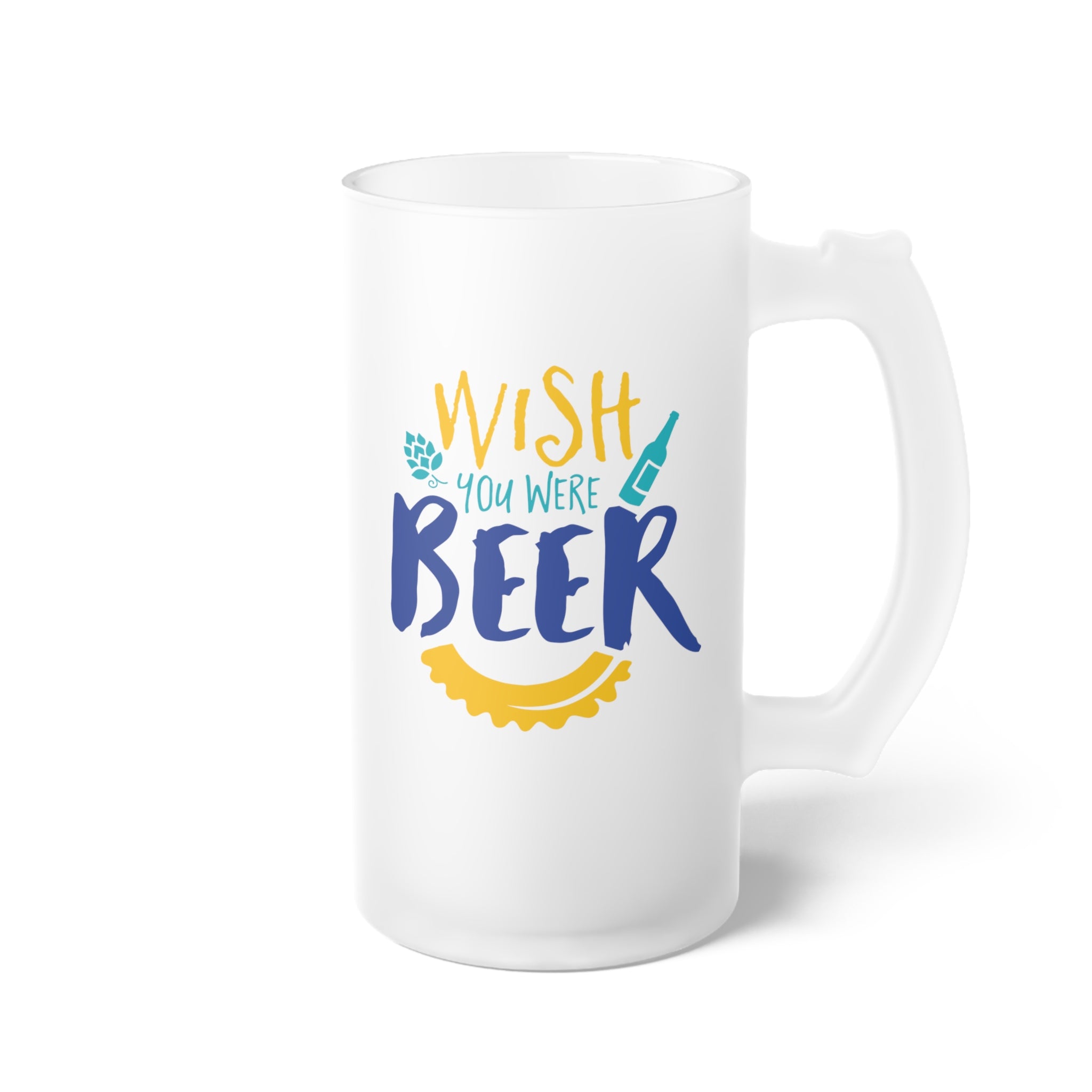 The mug is crafted from frosted glass, which not only gives it a smooth, opaque, and non – slip grip but also helps to keep your drinks cold for longer. The base color of the mug is a frosted white, while the vibrant accent colors of yellow, blue, and teal are used for the text and graphics. The text “WISH YOU WERE BEER” is a fun pun, with “WISH” in bold yellow, “YOU WERE” in teal, and “BEER” in large, bold blue. There are also teal hop cone next to “WISH”, a teal beer bottle next to “YOU WERE”, and a yellow bottle cap/sunburst shape below “BEER”. The design is clean, bold, and whimsical, creating a casual, festive vibe.