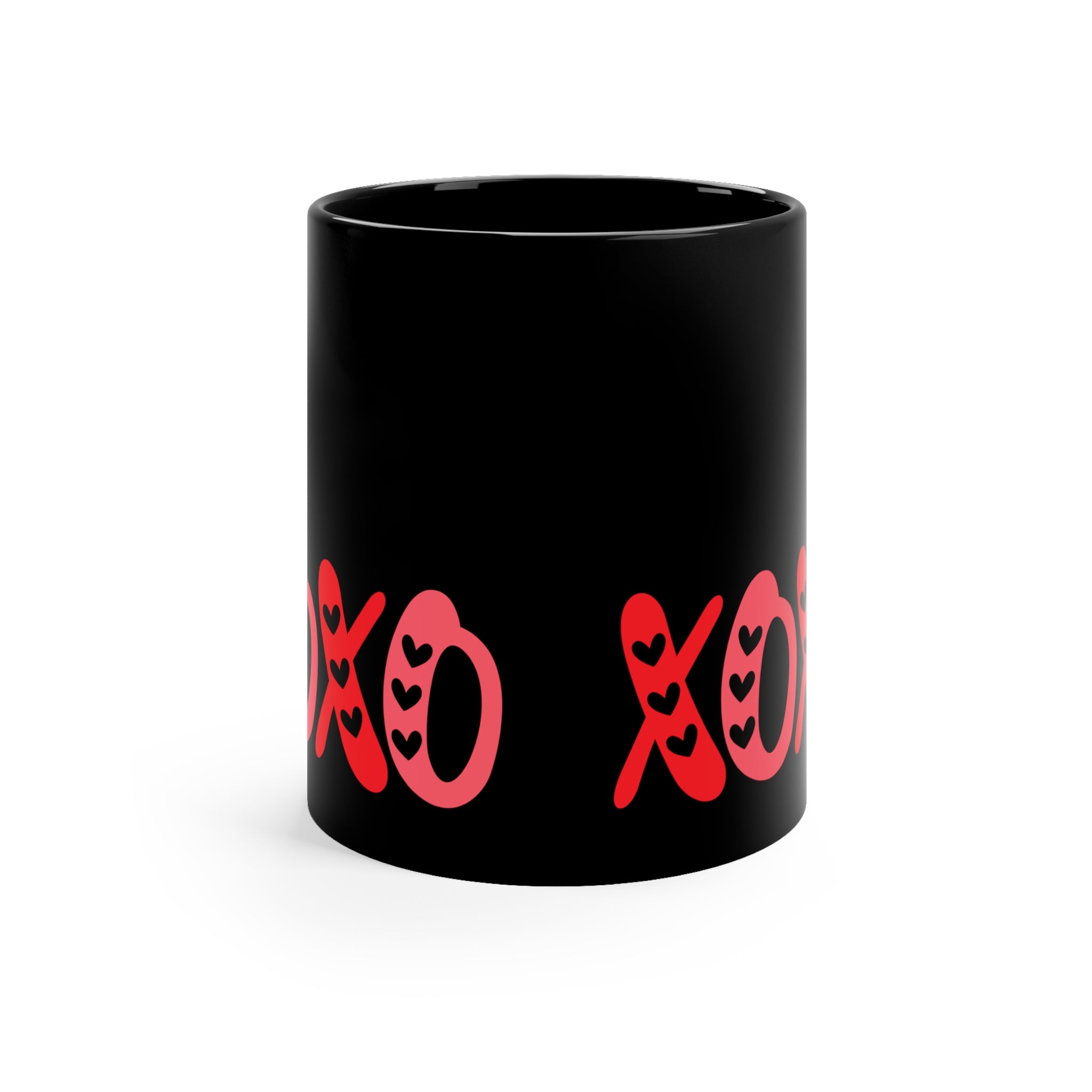 The mug features a solid black exterior with bold red (for “X”) and pinkish – red (for “O”) text spelling “XOXO”. Small black hearts are integrated into each “X” and “O”, adding a whimsical and romantic touch. The “X”s are cross – shaped with rounded ends, and the “O”s are filled with hearts, creating a playful and affectionate design that is ideal for Valentine’s Day or as a cute daily – use mug.